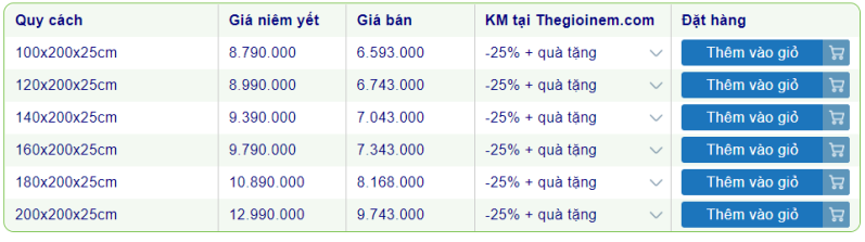 Giữa muôn vàn các dòng nệm, thương hiệu nệm khác nhau, khách hàng thường gặp khó khăn trong việc đưa ra quyết định. Do đó, Thế Giới Nệm đã tập hợp bảng giá nệm lò xo được ưa chuộng nhất để khách hàng dễ dàng tham khảo và chọn mua: