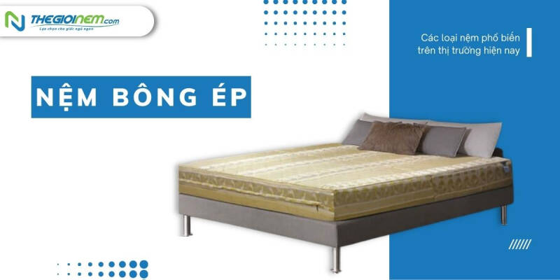 Nệm bông ép được biết với một cái tên khác đó là nệm P.E. Đây là loại nệm được sản xuất từ 100% nguyên liệu P.E, được cấu tạo từ những tấm bông ép cứng lại, tạo độ đàn hồi cao và hạn chế tối đa sự xẹp lún trong quá trình sử dụng.